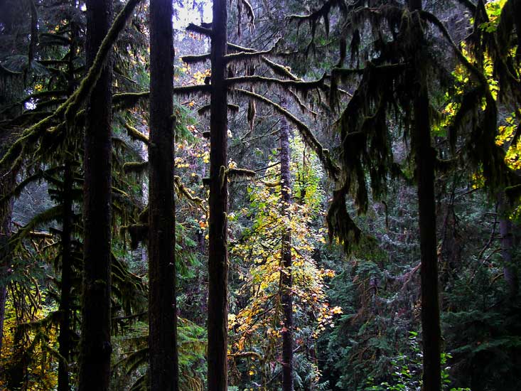 Maples begin turning first, and often become red. A few other trees and bushes have begun to glow, this like a flame encircled by evergreens. We are in a forest surrounded by clearcuts and second growth trees, west of Eugene, but this hillside woods is hoary and fascinating.